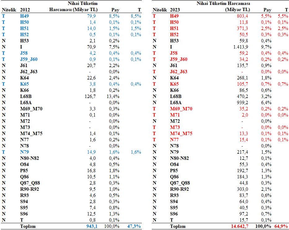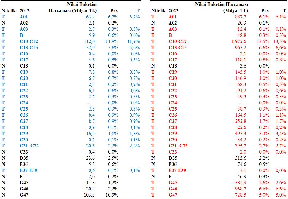 Girdi-çıktı tablolarına dayanılarak yapılan hesaplamalara göre, hanehalkı nihai tüketimi içinde dış ticarete konu olan mal ve hizmetlerin ağırlığı 2012 yılında %47,3 iken, 2023 yılında %64,9 düzeyine yükselmiştir. Bu artışın yaklaşık 14 puanlık kısmı, 2012 yılında dış ticarete konu olmayan ancak 2023 yılında dış ticarete konu niteliği kazanan aşağıdaki sektörlerden kaynaklanmaktadır: