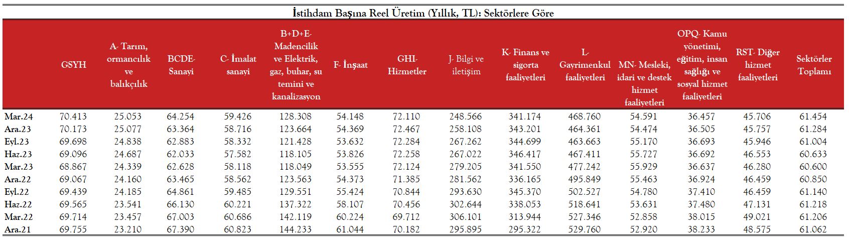 Mart 2022-Mart 2023 döneminde İmalat Sanayiinde istihdam başına reel katma değer %4,23 azalarak 60.686 TL’den 58.118L’ye düşmüştür. Mart 2023-Mart 2024 döneminde ise İmalat Sanayiinde istihdam başına katma değer %2,25 artmıştır.