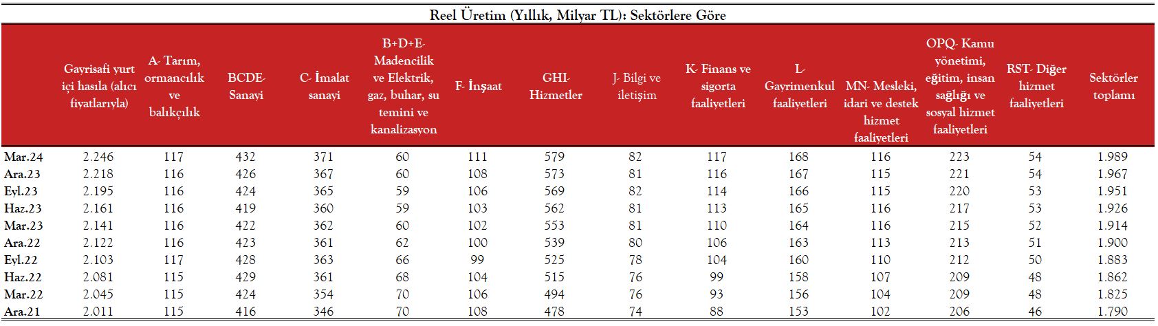 Aşağıdaki tabloda sektörlere göre yıllık reel üretim (katma değer) sunulmuştur.
