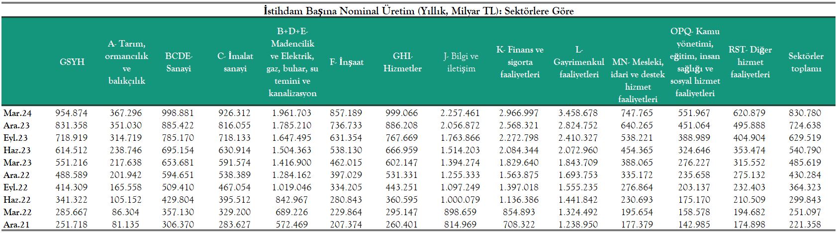 Sektörlere göre nominal üretim değerlerinin sektörlere göre istihdama bölünmesiyle bulunan istihdam başına nominal katma değerler aşağıdaki tabloda gösterilmiştir.