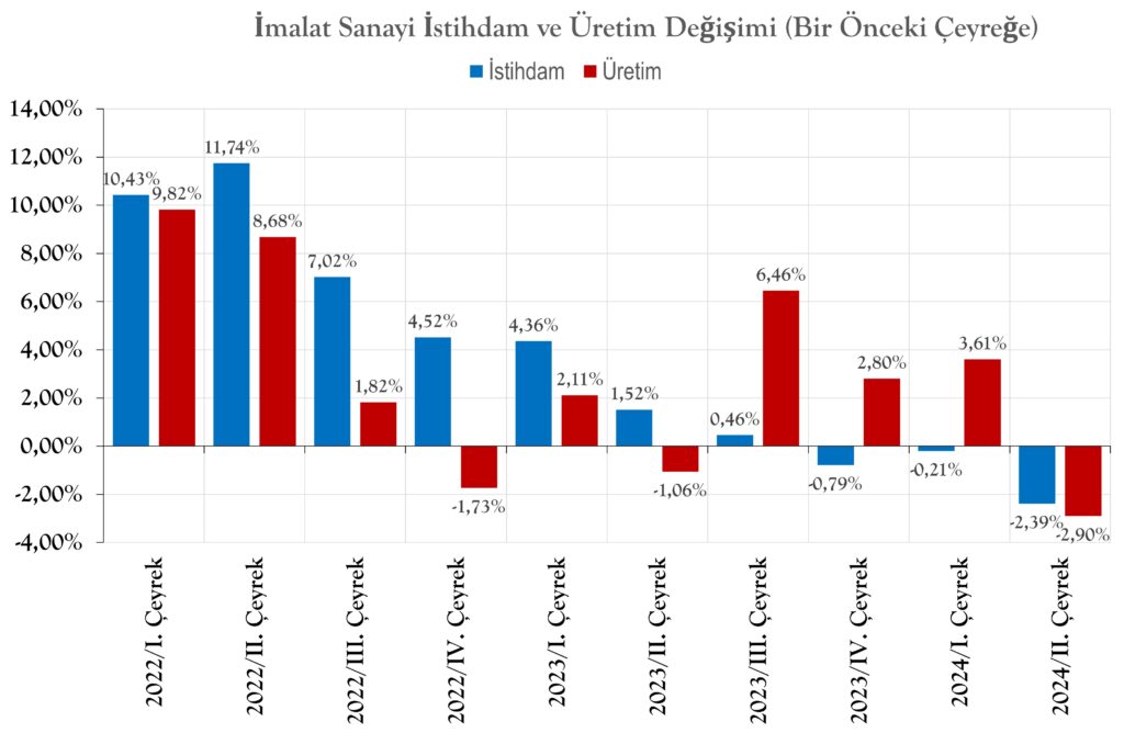 Aşağıdaki grafiktende (grafik başlığında yazım hatası vardır, bir önceki çeyreğe değil bir önceki yılın aynı çeyreğine göre olacak) görüldüğü üzere 2022 yılı ikinci çeyreğinden sonra bir önceki yılın aynı çeyreğine göre çeyreklik istihdam artış hızı azalıyor. 2023 yılı üçüncü çeyreğinde ise bir önceki yılın aynı çeyreğine göre çeyreklik istihdam düşmeye başlamıştır. 2024 yılı ikinci çeyreğinde ise istihdamdaki bu düşüşe üretim düşüşü de eşlik etmiştir.