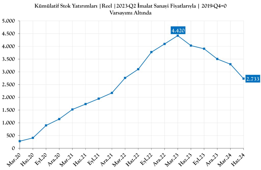 Aşağıdaki grafikte 2024 yılı ikinci çeyrek imalat sanayi fiyatları ile realize edilmiştir. Ve reel Stok Yatırımları 2019 yılı dördüncü çeyrek 0 kabul edilerek, 2021-Q1 ile 2024-Q2 dönemi için kümülatif (birikimli) olarak gösterilmiştir.
