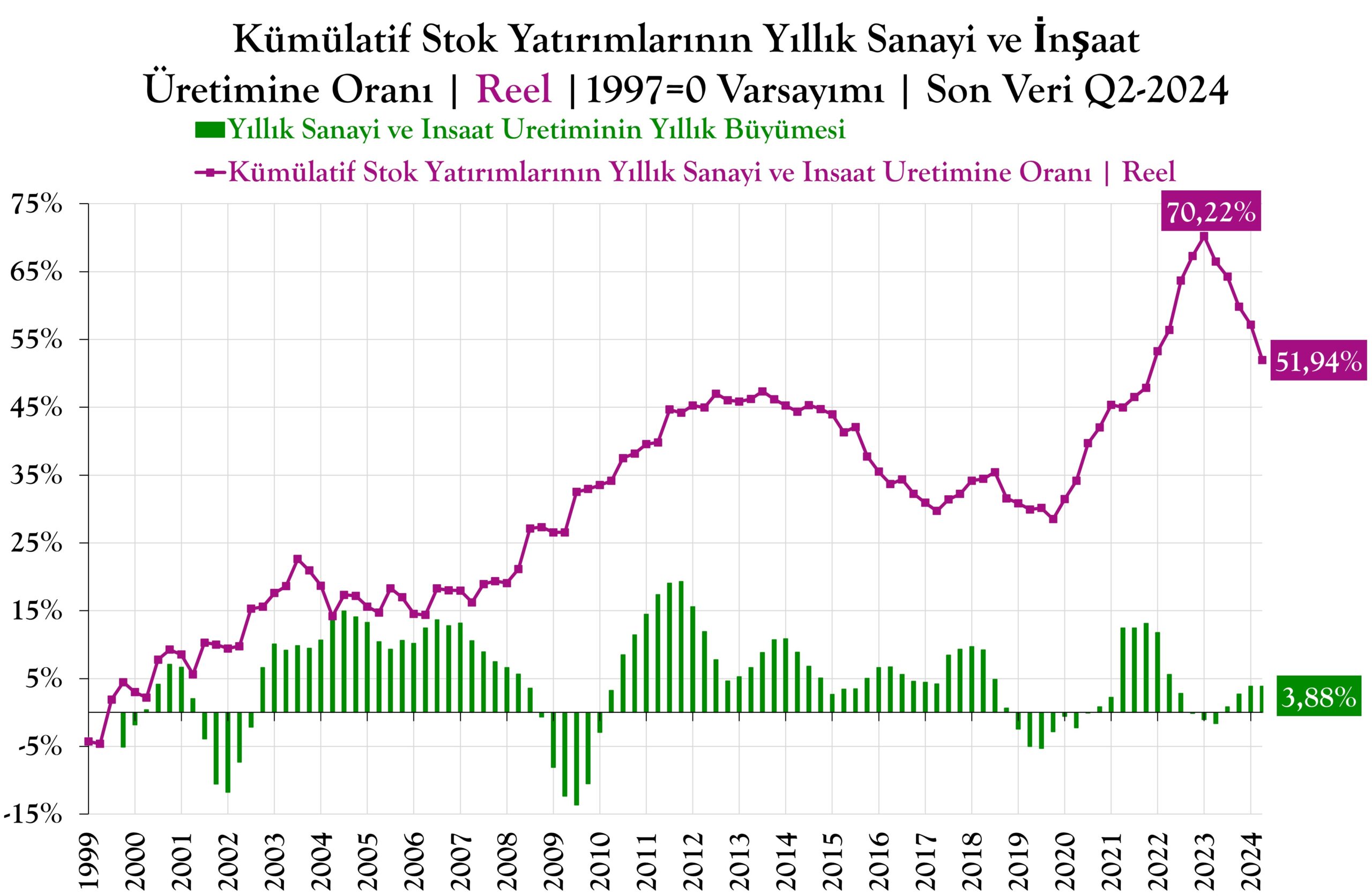 2024 yılı ikinci çeyrek Sanayi ve İnşaat ağırlıklı fiyatları baz alınarak Stok Yatırımları realize edilmiştir. Kıyaslamaya burada GSYH değil Sanayi ve İnşaat Üretimi konu olmuştur.