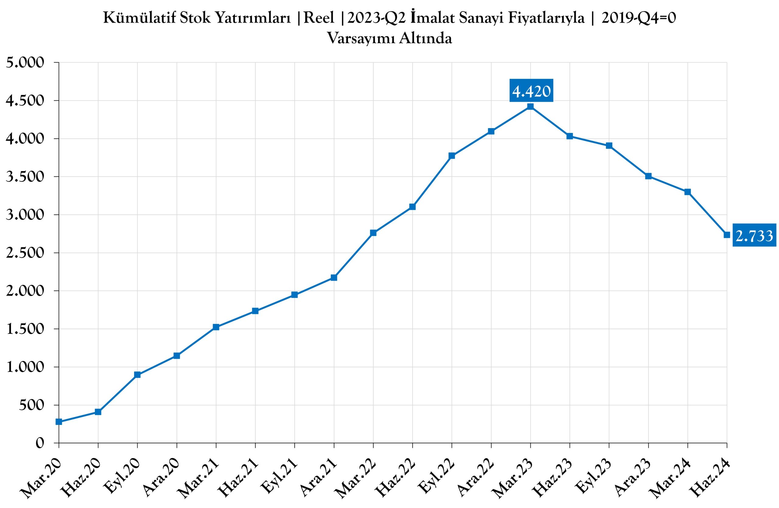 Aşağıdaki grafikte 2024 yılı ikinci çeyrek imalat sanayi fiyatları ile realize edilmiştir. Ve reel Stok Yatırımları 2019 yılı dördüncü çeyrek 0 kabul edilerek, 2021-Q1 ile 2024-Q2 dönemi için kümülatif (birikimli) olarak gösterilmiştir.