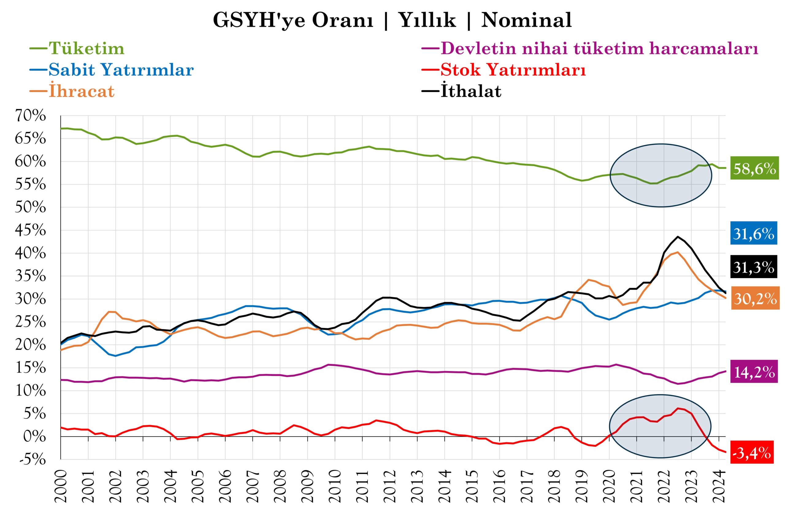 Aşağıdaki grafikte ise Sabit ve Stok Yatırımlarının GSYH’ye oranı gösterilmiştir. 2020 yılı ilk çeyreğinden sonra Stok Yatırımları başlamış ve 2023 yılı ilk çeyreğine kadar devam etmiş ve 2023 yılı ikinci çeyreği ve sonrasında geçmişte yapılan Stok Yatırımları piyasaya arz edilmeye başlanmıştır. 2024 yılı ikinci çeyrek üretiminin %5,7’si kadar mal geçmiş Stok Yatırımlarından piyasaya arz edilmiştir.