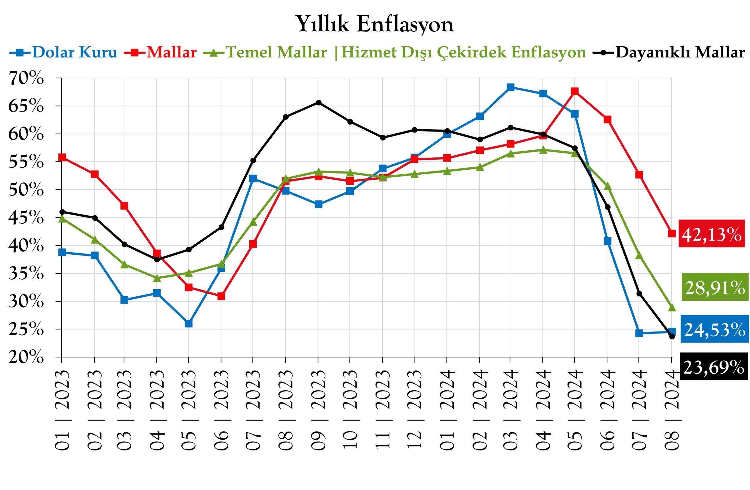 Ağustos 2023 ile Ağustos 2024 döneminde yani son bir yılda dolar kuru %24,53 artmıştır. Temel Mallar ise aynı dönemde %28,91 artmıştır. Dayanıklı Mallar (Altın Hariç) ise %23,69 artmıştır.