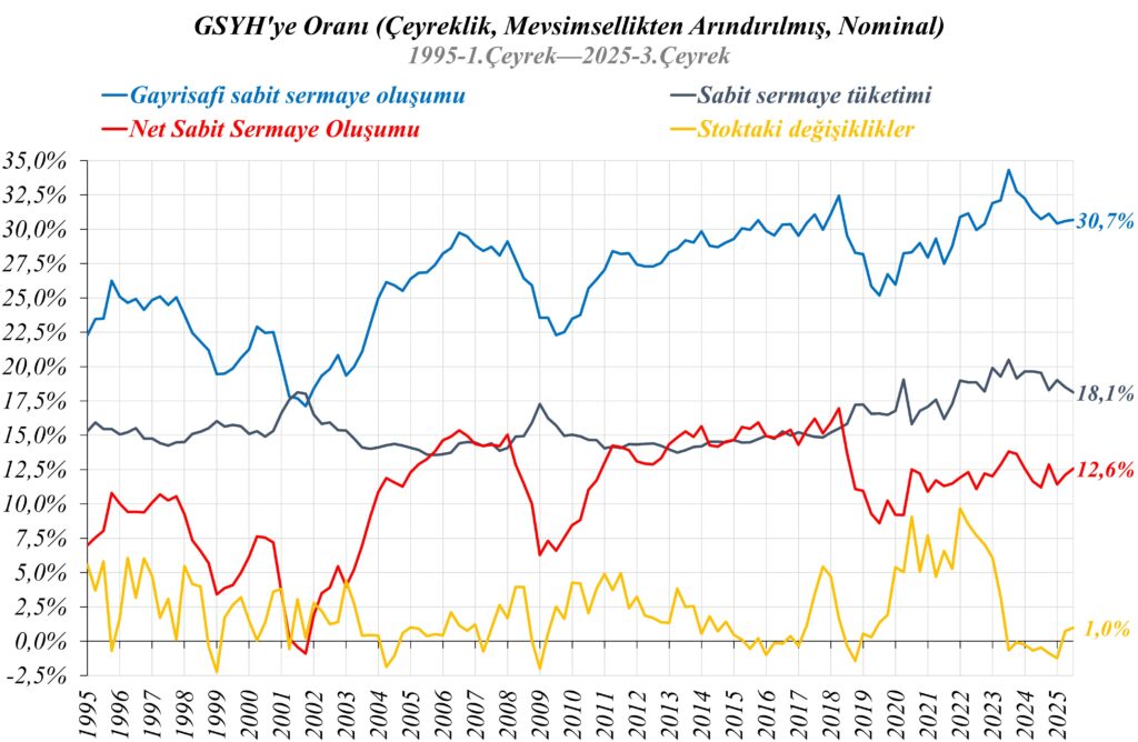 TÜİK verileri, düşük faiz döneminde yatırımların arttığını gösteriyor. Ancak bu artışın ağırlıklı olarak stok birikiminden kaynaklandığı anlaşılıyor. Sermaye yenilemeleri yapılmış, ancak net yatırımlarda kayda değer biçimde yükselme görülmemekte.